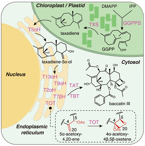 图 紫杉醇关键合成前体baccatin III(巴卡亭III)的生物合成过程