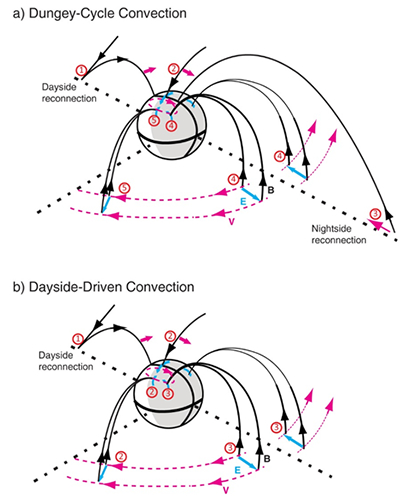 ![]() 图 磁层对流增强示意图。a) 经典的Dungey循环对流模式,b) 日侧驱动的磁层对流模式。a)图体现的夜侧驱动对流和b)图体现的日侧驱动对流是两个独立过程。黑色箭头代表磁力线,粉色箭头代表对流方向,蓝色箭头代表对流电场 太阳风是来自太阳的带电粒子流,持续不断地压缩地球磁场的磁力线而形成的空间称为地球磁层。等离子体物质的全球尺度对流是行星(地球)磁层的基本特征。太阳风的物质和能量对行星磁层的作用,特别是磁层中等离子体对流运动的驱动机制一直是太阳风-磁层耦合的前沿科学问题。 全球尺度磁层对流循环模式(Dungey Cycle)自20世纪60年代提出以来,一直是描述太阳风-磁层耦合的基本模式,在地球空间能量爆发事件(如磁暴、亚暴)等空间天气现象中发挥着关键作用。然而,该经典模式仅预言了等离子体对流周期一般在小时量级,在解释10到20分钟的快速响应对流事件时遇到了困难。 在国家自然科学基金项目(42188101、42174207)等资助下,中国科学院国家空间科学中心戴磊研究员、王赤院士以及国际团队成员密切合作,深入分析了磁层对2016年3月11日太阳风的响应。数值模拟和观测数据分析表明,日侧磁重联通过激发1区和2区的场向电流,直接驱动了磁层内的向日对流,对流增强在10-20分钟内即从日侧逐渐扩展到夜侧。值得注意的是,该过程在行星际磁场从北转南后几乎是即时发生的,在同一时段,夜侧磁重联并没有影响磁层对流模式。而在经典的磁层对流循环模式中,日侧和夜侧磁重联必须是一起联合运作的两个驱动。该研究提出了经典对流循环模式外的新图像(Pattern)——日侧磁重联直接驱动的磁层对流,表明日侧和夜侧磁重联可以相互独立地驱动磁层大尺度对流,支持了现代的扩展/收缩极盖模型和直驱亚暴模型的预期。 相关研究成果以“日侧磁场重联驱动的全球尺度磁层对流(Global-scale magnetosphere convection driven by dayside magnetic reconnection)”为题,于2024年1月20日在《自然·通讯》(Nature Communications)在线发表,论文链接:https://doi.org/10.1038/s41467-024-44992-y。 研究强调了大尺度场向电流和等离子体对流在太阳风-磁层耦合中的关键作用,所提出的新物理图像可以在预期2025年发射的中欧联合空间科学卫星项目“微笑计划(SMILE)”任务中得到进一步检验。研究结果对于我们了解行星磁层空间的基本物理过程、提高空间天气预报的准确性具有重要的科学和应用价值。 |