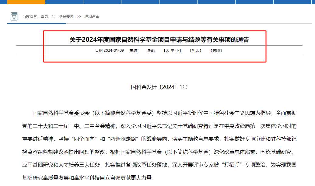 1月9日,国家自然科学基金委员会发布《关于2024年度国家自然科学基金项目申请与结题等有关事项的通告》。